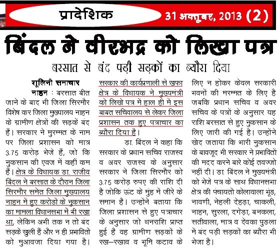 डा. बिन्दल ने मुख्यमंत्री वीरभद्र सिंह को लिखा पत्र