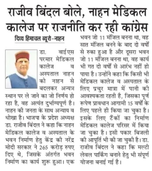 नाहन मेडिकल कॉलेज पर प्रकाशित एक समाचार