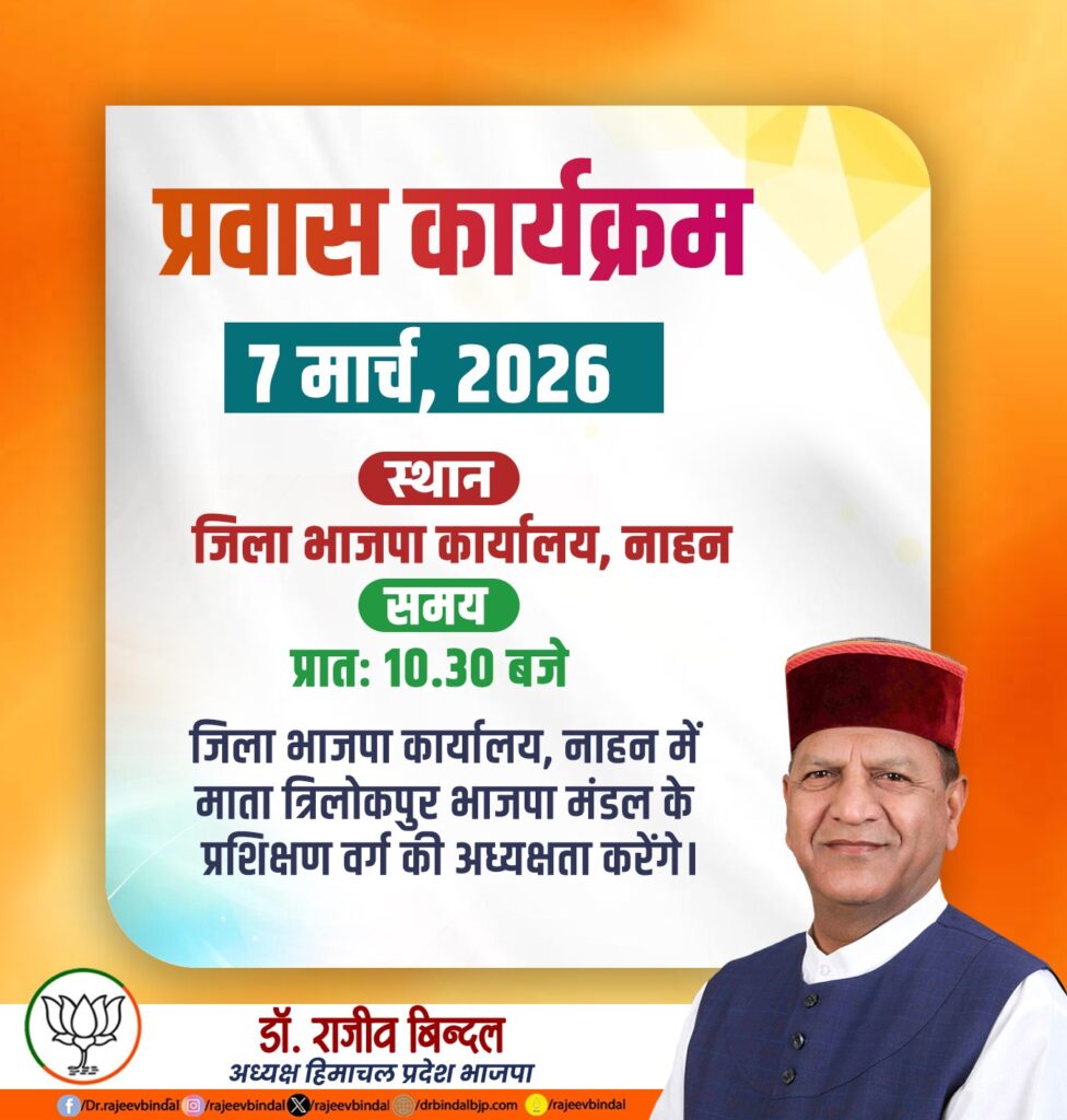 Home प्रवास कार्यक्रम : 7 मार्च 2026 6 March, 2026 Author Main Photo Section Main Content Section भाजपा प्रदेश अध्यक्ष डॉ. राजीव बिंदल जी का 7 मार्च 2026 का प्रवास कार्यक्रम। Gallery Section Share Copy Link to Share My Blogs Recent Posts