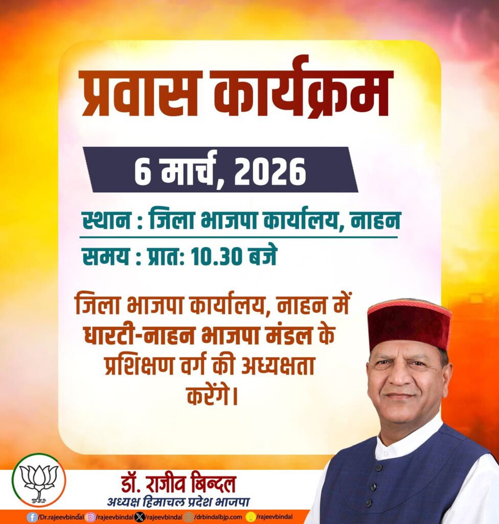 Home भाजपा मण्डल धारटी- नाहन का प्रशिक्षण वर्ग नाहन में आयोजित 6 March, 2026 Author Main Photo Section Main Content Section भाजपा प्रदेश अध्यक्ष डॉ. राजीव बिंदल की अध्यक्षता में शुक्रवार को पंडित दीन दयाल उपाध्याय महाप्रशिक्षण अभियान-2026 के अंतर्गत जिला भाजपा कार्यालय नाहन में भाजपा धारटी- नाहन मण्डल का एक दिवसीय प्रशिक्षण वर्ग आयोजित […]