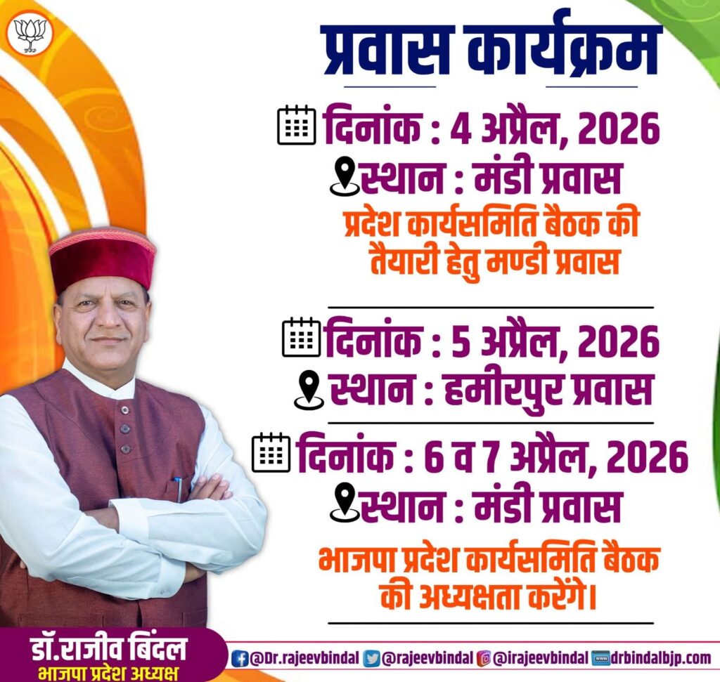Home भाजपा प्रदेश कार्य समिति बैठक की तैयारियों की समीक्षा 5 April, 2026 Author Main Photo Section Main Content Section भाजपा प्रदेश अध्यक्ष डॉ. राजीव बिंदल, नेता प्रतिपक्ष श्री जयराम ठाकुर जी के साथ मंडी में 6 और 7 अप्रैल 2026 को आयोजित होने वाली भाजपा प्रदेश कार्यसमिति की बैठक की व्यवस्थाओं की समीक्षा करते […]