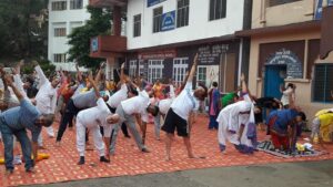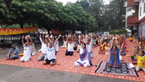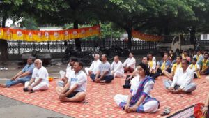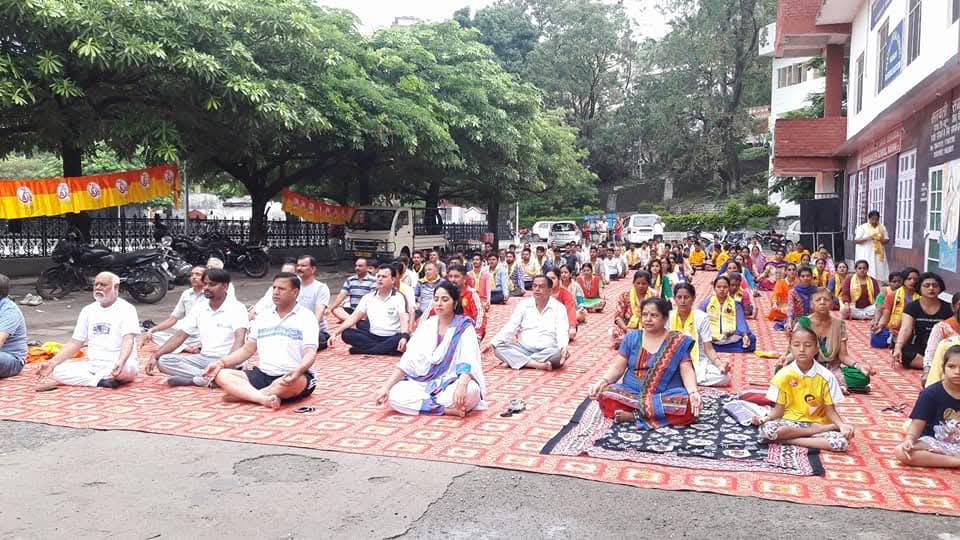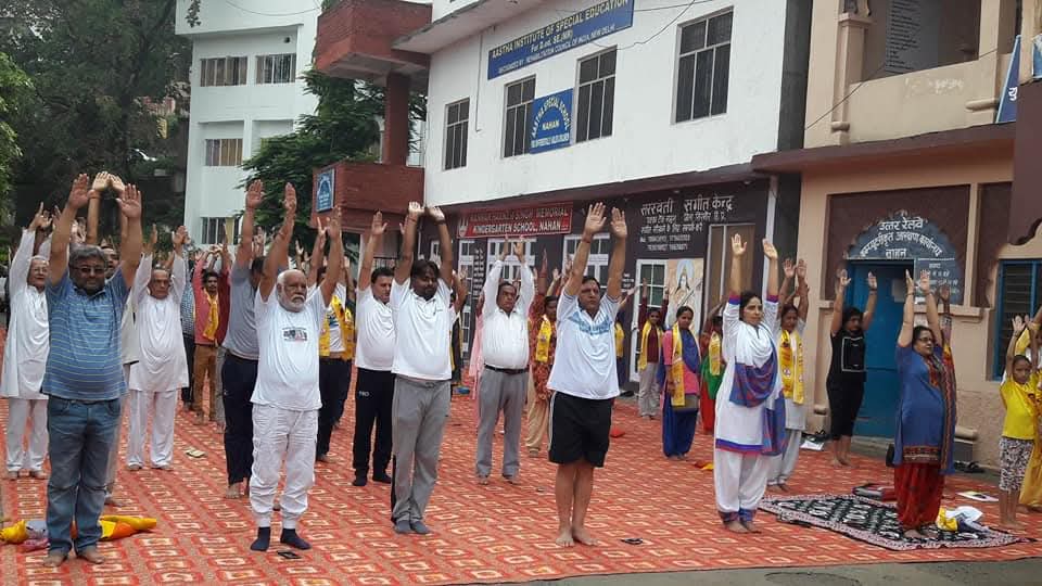 विश्व योग दिवस पर नाहन के पक्का टैंक योगासन करते हुए