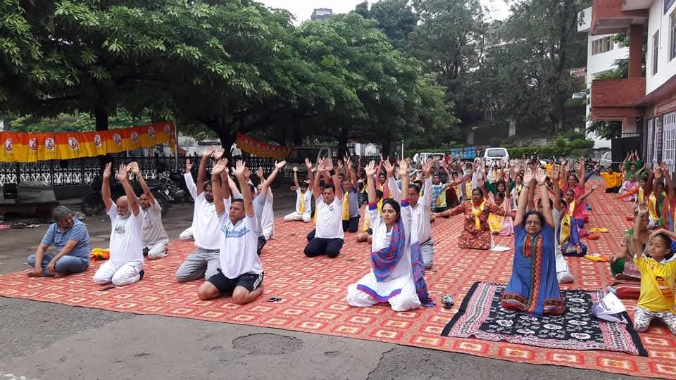 आज विश्व योग दिवस के उपलक्ष्य पर नाहन के पक्का टैंक के पास आयोजित कार्यक्रम में योगासन करते हुए।