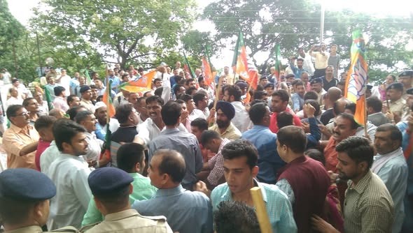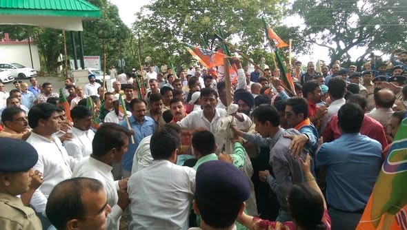 सिरमौर भाजपा द्वारा किये जा रहे शांतिपूर्ण धरने को पोलिस प्रशासन द्वारा धक्का-मुक्की में तबदील कर दिया गया। सिरमौर भाजपा उपायुक्त सिरमौर के कार्यालय में शांतिपूर्वक धरना करते हुए जिसे पुलिस के लोगों द्वारा कांग्रेस के नेताओं के कहने पर भाजपा नेताओं के साथ धक्का मुक्की की गई ।