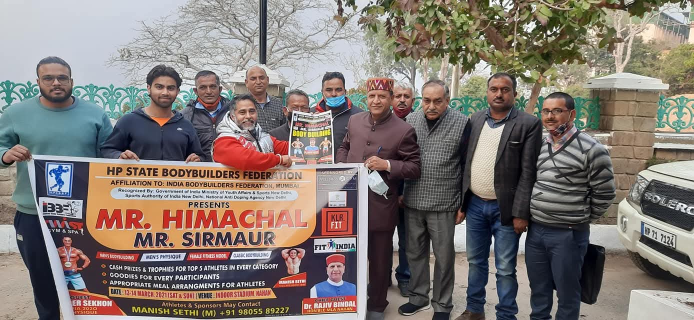 डा. राजीव बिन्दल नाहन में बॉडी बिल्डर प्रतियोगिता का पोस्टर जारी करते हुए। सिरमौर ज़िला मुख्यालय नाहन में 13-14 मार्च 2021 को बॉडी बिल्डिंग स्पोर्ट्स प्रतोयोगिताओं का आयोजन किया जा रहा है।