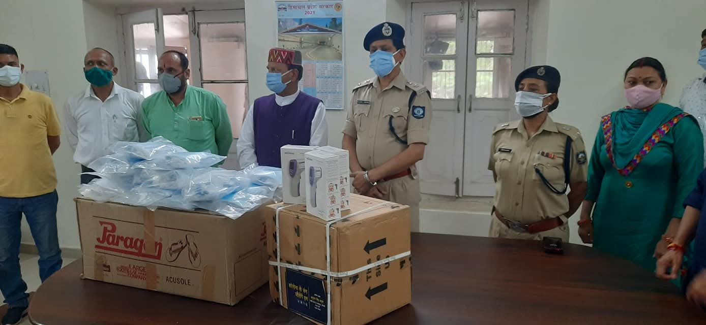 विधायक एवं पूर्व विधानसभा अध्यक्ष डा. राजीव बिन्दल ने आज केन्द्रीय वित्त राज्य मंत्री श्री अनुराग ठाकुर द्वारा सिरमौर पुलिस के लिए भेजी गई ‘‘कोरोना सामग्री किट’पुलिस अधीक्षक श्री खुशहाल शर्मा को भेंट की। इस अवसर पर अतिरिक्त पुलिस अधीक्षक श्रीमती बबीता राणा व एस.एच.ओ. नाहन मानवेन्द्र सिंह व अन्य पुलिस कर्मचारी भी उपस्थित थे।