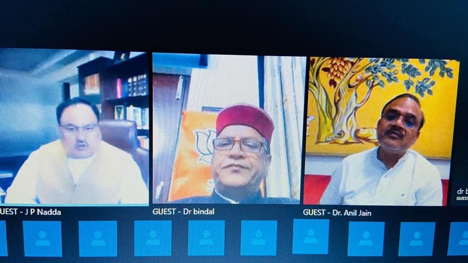 भाजपा प्रदेश अध्यक्ष डा. राजीव बिन्दल माननीय राष्ट्रीय अध्यक्ष श्री जगत प्रकाश नडडा जी के साथ आज वीडियो कांफ्रेसिंग पर संवाद करते हुए..!! वीडियो कॉन्फ्रेंसिंग के दौरान हिमाचल में कर्फ़्यू और लॉकडाउन की स्थिति पर विस्तृत चर्चा हुई..!! माननीय राष्ट्रीय अध्यक्ष जी के मार्गदर्शन में हम कोरोना के विरुद्ध जंग अवश्य जीतेंगे…!!