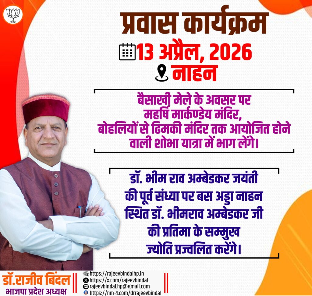 भाजपा प्रदेश अध्यक्ष डॉ. राजीव बिंदल 13 अप्रैल, 2026 को बैसाखी मेले के अवसर पर नाहन क्षेत्र के महर्षि मार्कण्डेय मंदिर, बोहलियों से ढिमकी मंदिर तक आयोजित होने वाली शोभा यात्रा में भाग लेंगे।