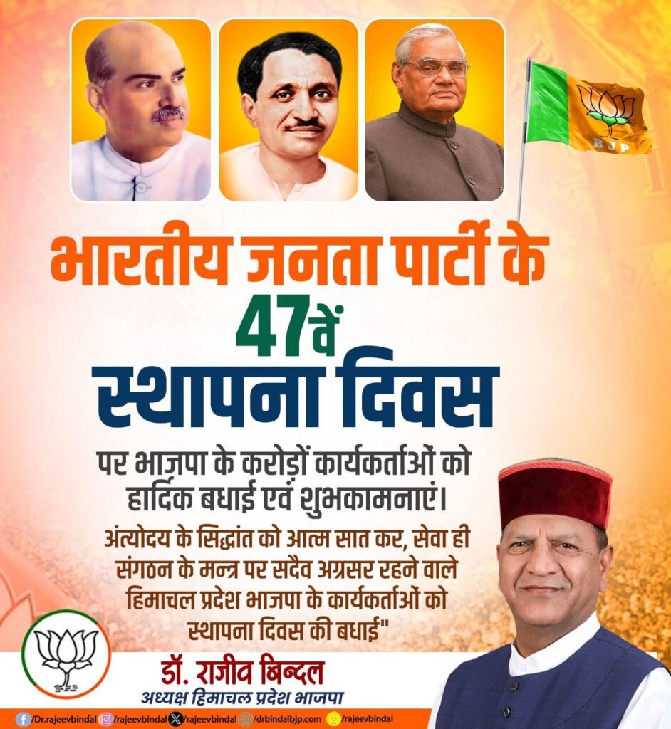 भाजपा प्रदेश अध्यक्ष डॉ. राजीव बिंदल ने भारतीय जनता पार्टी के स्थापना दिवस पर समस्त देशवासियों और देवतुल्य कार्यकर्ताओं को हार्दिक बधाई व शुभकामनाएं दी हैं।