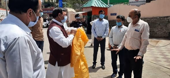 भाजपा प्रदेश अध्यक्ष डा. राजीव बिन्दल डा. यशवंत सिंह परमार मैडिकल कॉलेज एवं अस्पताल में मैडिकल, पैरा मैडिकल तथा अन्य चिकित्सीय सेवा में कार्यरत कर्मियों को सुरक्षा गाऊन प्रदान करते हुए।