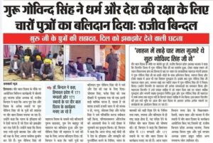 वीर बाल दिवस पर समाचार पत्रों प्रकाशित समाचार